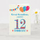 Una tarjeta de cumpleaños colorida para un bisnieto de 12 años, El gran número 12 está lleno de un patrón naranja, rojo y azul, delineado en azul brillante. Hay globos y racimos en la parte superior, en colores que coinciden y el saludo de la portada es, '¡Gran nieto, hoy tienes 12 años!' con letras brillantes rojas y azules, en un fondo de puntos de polka amarillo y blanco muy pálido, con estrellas rojas y naranjas a cada lado de la palabra '¡HOY!'. El mensaje interno se puede personalizar o borrar fácilmente si lo desea.