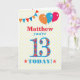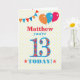 Una tarjeta de cumpleaños colorida para un niño de 13 años para que personalizar con un nombre. El gran número 13 está lleno de un patrón naranja, rojo y azul, delineado en azul brillante. En la parte superior hay globos y racimos, con colores que coinciden y el saludo de la portada es "(aquí se llama), ¡hoy tienes 13 años!" con letras brillantes rojas y azules, en un fondo de polka blanco y amarillo muy pálido, con estrellas rojas y naranjas a cada lado de la palabra "¡HOY!". El mensaje interno se puede personalizar o borrar fácilmente si lo desea.