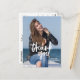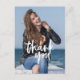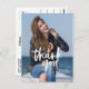 Tarjeta postal de graduación de agradecimiento con letra script en negrita blanca.
