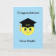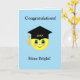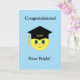 Brilla brillante tarjeta de felicitaciones con gorra de graduación y cara feliz con fondo azul claro. Ideal para graduaciones. ¡El texto puede ser personalizado!