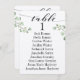 Tarjetas de gráfico de mesa con escritura de caligrafía negra con fuente florida sobre papel blanco crujiente con ramitas de eucalipto verde con nombres de asientos para diez personas.
