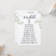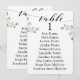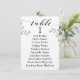 Fuente de letra caligráfica negra con escritura de caligrafía negra contra papel blanco crujiente con tarjetas de gráfico de mesa de ramitas de eucalipto verde para diez personas.