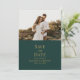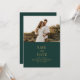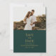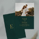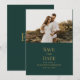 Anuncia tu día especial con estilo con nuestra Tarjeta de Guarda la Fecha de Foto Personalizada Verde Esmeralda. La mitad superior presenta una foto, complementada con texto dorado sobre un fondo verde esmeralda debajo. La parte posterior muestra elegantes monogramas dorados sobre un fondo verde esmeralda. Una forma chic y personalizada de marcar la fecha de tu boda.