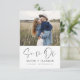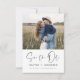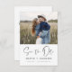 Tarjeta moderna y elegante de guardar fecha de boda con foto. La tarjeta de invitación de guardar fecha incluye tipografía blanca a mano y un diseño simple y chic en un fondo blanco donde puedes agregar la foto de tu compromiso personalizada.