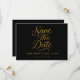 Haz una declaración con esta romántica tarjeta de guardar la fecha con caligrafía dorada sobre un fondo negro elegante. Con un diseño horizontal y un código QR para una respuesta fácil, este diseño es perfecto para bodas modernas, elegantes o formales. Totalmente personalizable con tus detalles.