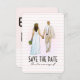 Un diseño simple y moderno de tarjeta de guardar la fecha. La parte frontal tiene una ilustración de una novia y un novio caminando de la mano junto con el anuncio de "save the date". La parte posterior del diseño sigue el esquema de color rosa, marrón y blanco. Tiene el nombre de la novia y el novio en letras grandes y negritas en la parte de arriba. Y en la parte de abajo, la fecha y los detalles de la ubicación.