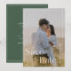 Una tarjeta moderna de guardar fecha de boda con foto que presenta un elegante diseño verde salvia combinado con un diseño de foto minimalista. Perfecta para parejas que buscan una estética refinada y contemporánea con un toque suave y romántico.