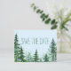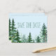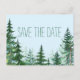 Tarjetas postales de guardar la fecha de boda de abeto con árboles rústicos en un fondo azul pálido. Puede agregar el texto de su elección en el estilo de fuente que prefiera. También puede cambiar la fuente y el color de fondo.