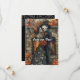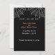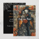 Tarjeta de guardar la fecha de boda de Halloween con una linda pareja de esqueletos vestidos con sus mejores ropas. La novia lleva un vestido negro con imágenes de calaveras y tiene calabazas en el pelo. El novio lleva un traje negro y sombrero de copa puntiagudo. Hay grandes arañas negras arrastrándose alrededor mientras un murciélago cuelga del manto. Invitación de boda gótica que se puede personalizar según tus necesidades.