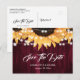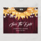 Tarjetas postales de guardar la fecha de boda rústicas de color burdeos y girasol que presentan girasoles y luces de cuerda en un fondo de madera rústica. Artículos coincidentes disponibles.