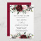 Esta elegante tarjeta de guardar la fecha de boda presenta una hermosa disposición floral de acuarela en tono rosa y borgoña. Diseñada para coincidir con nuestra colección de boda Rustic Blush. Personalízala con tus detalles de manera fácil y rápida, simplemente presiona el botón de personalizar para reorganizar y dar formato al estilo y ubicación del texto. (c) The Happy Cat Studio