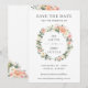 Esta elegante tarjeta de guardar la fecha de boda cuenta con un hermoso wreath floral en acuarela en marfil, melocotón y rosa. Diseñada para coincidir con nuestra colección de bodas Luxe. Personalice los detalles de manera fácil y rápida, simplemente presione el botón personalizar para reorganizar y dar formato al estilo y ubicación del texto. (c) The Happy Cat Studio