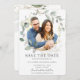 Resalte su foto pre-nupcial con esta tarjeta de guardar la fecha de estilo boho chic. Con hermoso follaje de vegetación en acuarela. Personalícela con sus detalles de manera fácil y rápida, simplemente presione el botón de personalizar para reorganizar y dar formato al estilo y ubicación del texto.