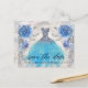 Tarjetas postales de guardar la fecha de Quinceañera con diseño floral moderno. Diseño con vestido azul, elementos florales azules y grises sobre un fondo perla brillante. Personalice con su foto y detalles en el reverso.