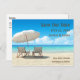Esta tarjeta moderna es ideal para anunciar una boda de playa o de destino. Cuenta con una imagen hermosa y serena de una orilla de playa. Hay dos sillas de playa y un paraguas de playa en la arena. Esta tarjeta es ideal para una boda frente al océano. Agregue los detalles de su evento.
