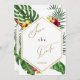 Tarjeta de guardar la fecha con diseño tropical, hojas tropicales, flores amarillas y rojas, geométricos dorados y caligrafía. Fácil de personalizar calendario en la parte posterior donde también puede destacar su fecha con una pequeña hoja tropical.