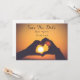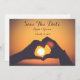 Tarjeta de guardar la fecha con silueta de manos de enamorados con una puesta de sol en el fondo