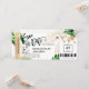 Destino Boda de Playa Pase de Abordar Ticket Dorado Avión Guardar la Fecha con corazón e icono de avión con hojas tropicales