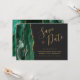 Esta elegante tarjeta moderna para guardar la fecha presenta un borde de ágata de acuarela verde esmeralda recortado con brillo dorado falso. El texto personalizable combina escritura a mano dorada, caligrafía copperplate y fuentes itálicas sobre un fondo gris oscuro carbón. El reverso presenta un diseño a juego de ágata verde esmeralda y dorada.