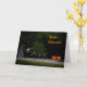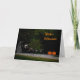 Fantasma tarjeta de Halloween con fantasmas bailando y esqueletos. La carta es oscura como la noche con calabazas y ojos en la oscuridad.