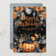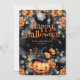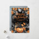 Foto tarjeta de Halloween con una linterna de jack-o' con un gorra negro y adornada con flores naranjas en el frente y una foto en la parte de atrás. Personaliza fácilmente esta hermosa tarjeta de fotos de Halloween con tu foto y el nombre de la familia.