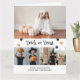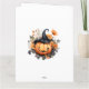 Carta feliz de Halloween con un collage de fotos con huellas de pata en el frente, un fantasma esqueleto con una linterna de jack-o' dentro, y una calabaza con un gorra de brujas negro y adornada con flores naranjas en la parte de atrás. Personaliza fácilmente esta linda tarjeta de Halloween con tu nombre familiar y texto.