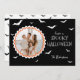 Envía tus saludos de Halloween a familiares y amigos con esta tarjeta que presenta murciélagos blancos, textos y una foto con un marco blanco único y un toque de naranja. Patrón de murciélago negro sobre fondo blanco en la parte trasera de la tarjeta.