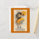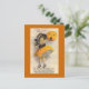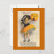 Hermosa tarjeta vintage de Halloween que muestra a una niñita vestida de amarillo y negro sorprendida por una cara de calabaza.