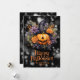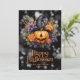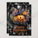 Feliz tarjeta de Halloween con una calabaza con un gorra negro y adornada con flores moradas y naranjas. Personaliza fácilmente esta tarjeta de Halloween con tu nombre y texto familiar.