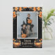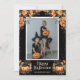 Foto personalizado de la tarjeta de Halloween con una foto adornada con lámparas de color agua con gorras negros, flores naranjas y vegetación. Personaliza fácilmente esta linda tarjeta de fotos de Halloween con tu foto y el nombre de la familia. Esta tarjeta de fotos de Halloween se puede convertir en cualquier color usando la herramienta de personalización.