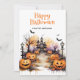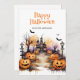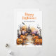 La tarjeta acuarela de Halloween presenta una mansión embrujada con calabazas espeluznantes, murciélagos y fantasmas divertidos. Personaliza fácilmente esta hermosa tarjeta de Halloween con tu nombre y texto familiar.