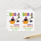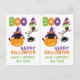 Esta linda postal de Halloween está diseñada para ser fácilmente cortada en dos cartas. La imagen es de un gatito negro con un gorra de brujas sentado dentro de una linterna de jack o'. Cerca del gatito hay un búho verde sobre una rama, y una pequeña araña negra cuelga de ella. El texto estilizado de arriba dice BOO en verde, naranja y morado. En la parte inferior hay dos campos de texto personalizado. La parte posterior tiene el texto de su personalizado y otra imagen del gatito. Perfecto para profesores de primaria o preescolar que den a los estudiantes en su fiesta de Halloween, ¡y económico también! O que su propio hijo se los dé a sus amigos de la escuela.