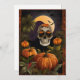 Tarjeta de felicitación de cráneo embrujado enmarcada con follaje tropical y calabazas - perfecta para compartir felicitaciones en Halloween o Día de Muertos.