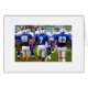 Vista posterior de una línea de jugadores de fútbol de secundaria norteamericanos entrando al campo de juego y enfrentando a sus oponentes con las manos atadas. Interior en blanco.