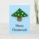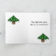 Un hongo personalizado con una tapa verde como un árbol verde. La gorra tiene manchas blancas, con algunas colgando, como si fueran canicas. El tallo marrón tiene una cara feliz, porque a todos los hongos les encantan las celebraciones. La parte delantera de la tarjeta dice "Feliz Navidad" y el interior dice "¡Este pequeño árbol no tomará demasiado hongo!" Los puntas de hongos pueden cambiarse si es necesario.