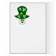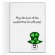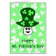 Un hongo personalizado con una parte superior verde en forma de gorra leprechaun. La gorra tiene manchas de champú. El tallo blanco tiene una cara feliz, porque a todos los hongos les encantan las celebraciones. El fondo es verde pálido, con un patrón de shamrock blanco. La parte delantera de la tarjeta dice "Feliz Día de San Patricio" y el interior dice "¡Que la suerte de los hongos esté contigo!"