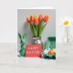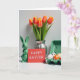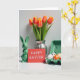 Esta tarjeta de felicitación muestra una escena de mesa en primavera sobre un fondo blanco brillante, dispuesta con una sensación de calma y proximidad, como amigos inclinándose para una foto. A la izquierda se sienta un conejo de cerámica verde brillante con orejas erguidas y rostro relajado 🐰. Justo al lado, una tarjeta roja se mantiene erguida con un breve mensaje de Pascua centrado en letras blancas pequeñas, llamando la atención como una nota silenciosa pasada entre seres queridos. Detrás de ellos, un ramo de tulipanes se eleva desde un jarrón de plata acanalado, con pétalos que pasan del naranja al amarillo suave y tallos verdes que llenan el espacio con color fresco 🌷. A la derecha, un cartón de color verde pálido sostiene huevos decorados, mezclando puntos negros, manchas naranjas y rayas simples que parecen cuidadosamente elegidos en lugar de apresurados. La luz suave y difusa suaviza las superficies y agrega resaltes suaves a la cerámica, el jarrón y las cáscaras de huevo, manteniendo el arreglo