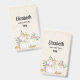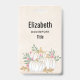 Etiqueta personalizada de nombre con elegantes calabazas blancas acuarelas con acentos de falso purpurina de oro. Rodeado de hojas verdes y flores silvestres rosas.