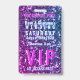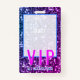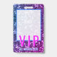 Una mesa de invitados con un pase VIP anunciando tu evento en la parte delantera, con un área en blanco en el reverso para escribir el nombre de tu invitado, la mesa o el número de asiento. La insignia está hecha de plástico de PVC, por lo que se requiere un marcador permanente, como un marcador Sharpie de punta fina, para escribir en este pase.