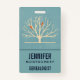 La etiqueta de nombre con un fondo verde silencioso en la parte superior es un árbol amarillo claro con dos siluetas de pájaro naranjas sentadas en las ramas.