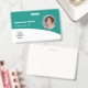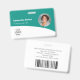 Personalice estas identificaciones horizontales de empleados de color azul turquesa con una foto de empleado, logotipo de la empresa, código de barras, identificación de empleado y nombre.