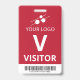 Insígnia de visitante vertical con un diseño simple en blanco sobre un fondo rojo mate. Una gran V blanca hace que sea fácil reconocer rápidamente al visitante como tal. Personaliza con el logotipo de tu empresa y un código de barras.