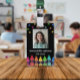 Insignia vertical de identificación de profesor de cuarzo personalizada con foto, nombre, nota bajo las coloridas estrellas y encima de una hilera de lápices de colores en un gradiente arco iris. Tarjeta de identificación de profesor de guardería con lápices de colores y estrellas.