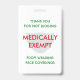 Elegante placa blanca MÉDICAMENTE EXENTA, mostrando MÉDICAMENTE EXENTO en texto rojo sobre una máscara gris pálido. El texto rojo y verde dice GRACIAS POR NO JUZGAR, MÉDICAMENTE EXENTO DE USAR CUBIERTAS DE CARA. Este texto es PERSONALIZABLE, por lo que puede reemplazarlo con su motivo de exención (por ejemplo, autismo, asma, discapacidad oculta, etc.) o puede agregar su nombre, si lo desea. El fondo es blanco. Esto da una gran respuesta a todas las miradas críticas y es una buena manera de demostrar que el distanciamiento social es necesario.