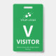 Insignia vertical de visitante con un diseño simple en blanco contra un fondo verde. Una gran V blanca permite reconocer rápidamente al visitante como tal. Personalice con el logotipo de su empresa.