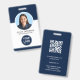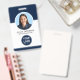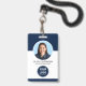 Personalice esta tarjeta de identificación de la empresa minimalista azul marino con su foto y nombre del empleado, título del trabajo, información comercial, logotipo y código QR. Mostrado aquí como un "Consultor de diseño" Photo ID Badge, este diseño moderno de color azul marino y blanco puede ser totalmente personalizado para cualquier negocio corporativo. Simplemente edite el texto, la foto, el logotipo y los campos de código QR para crear su propio identificador de empresa personalizado. Este sencillo y elegante distintivo de identificación es perfecto para todas las profesiones, incluyendo diseñadores gráficos, diseñadores de interiores, peluquero, peluquería, empleados médicos y hospitales.