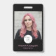 Wow your customers with this photo badge featuring an elegant typography design in bold black and blush pink together with your logo, plus a photo and the title of your employees. On the back personalize with your business name, your logo and all your contact information.