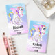 Insignia de nombre personalizada con la imagen de un unicornio con grandes ojos azules, alas rosadas y una forma y cola de arcoiris. Kawaii lindo.