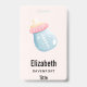 Tarjeta de nombre personalizada con una imagen bonita de una botella de bebé azul claro con un borde rosa.
