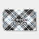 Insignia escudo del Clan Forbes rodeada de una correa y hebilla sobre un fondo escocés. Texto personalizado en ambos lados.